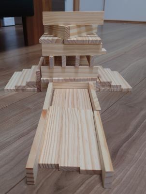 「もう4歳だからできるかな」と晴れて授与式となりました。どうしていいかわからない娘に、はねまあがなにげなく積み上げていると娘が「なかにはいっちゃおー♪」と片足を上からつっこむと「がしゃぁあん!」案の定壊れた。はねまあは意地になって「それならば!」と、娘を囲い始め、晴れて完成!ずっとじっとしていた娘が、この後すぐ「がしゃぁあん!」は言うまでもありません。二人とも良く頑張ったね。
