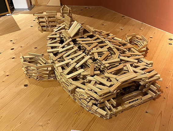 飛行機に大量に使われているカプラボールとは、1本たてた上に八角形のボールを乗せるKAPLA考案者の作品です。本作は、ひとつ完成するだけでも大変なボールの連続で機体を作るというとんでもない作品。さらにその機体を斜め上に傾かせるのは尋常ではないテクニックです。翼のしなりまで表現した作者のこだわりに敬意を表します。