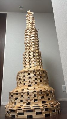 椅子に乗って天井まで届く高さのタワーを作りました。上の方は中心がズレつつも絶妙なバランスを保っています。